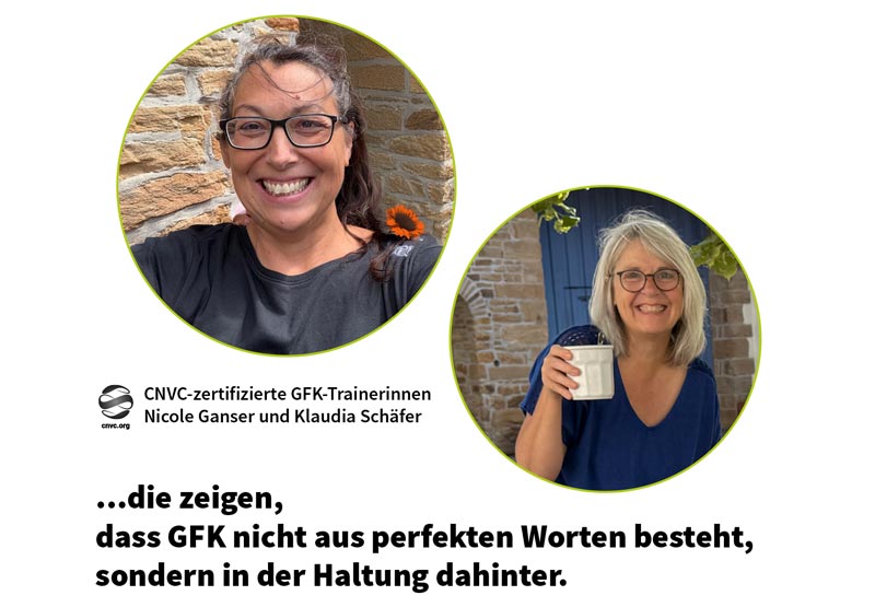 Wir – die GFK-Trainerinnen Nicole Ganser und Klaudia Schäfer – arbeiten seit über zehn Jahren eng zusammen als CNVC-zertifizierte Trainerinnen für Gewaltfreie Kommunikation (GFK). Unsere gemeinsame Arbeit verbindet langjährige Praxis, methodische Vielfalt und ein tiefes Verständnis für zwischenmenschliche Dynamiken – in Familien, Teams und Organisationen.